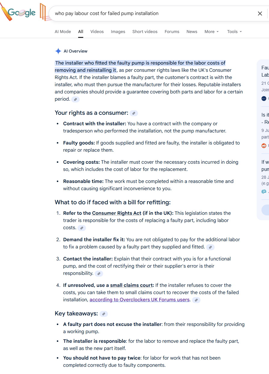 一年之内,英国都能把坏的泵退回去换个新的。容易混淆的一点是人工,这样回来更换是有人工的,那么是客户再掏人工钱还是安装公司负责吞下损失?英国的商业规范和法律案例都是,安装公司负责保修人工了,认倒霉吧。很多公司平时给部件加些钱 mark up 10% to 20% 左右, 就也算买这个倒霉的保险了。